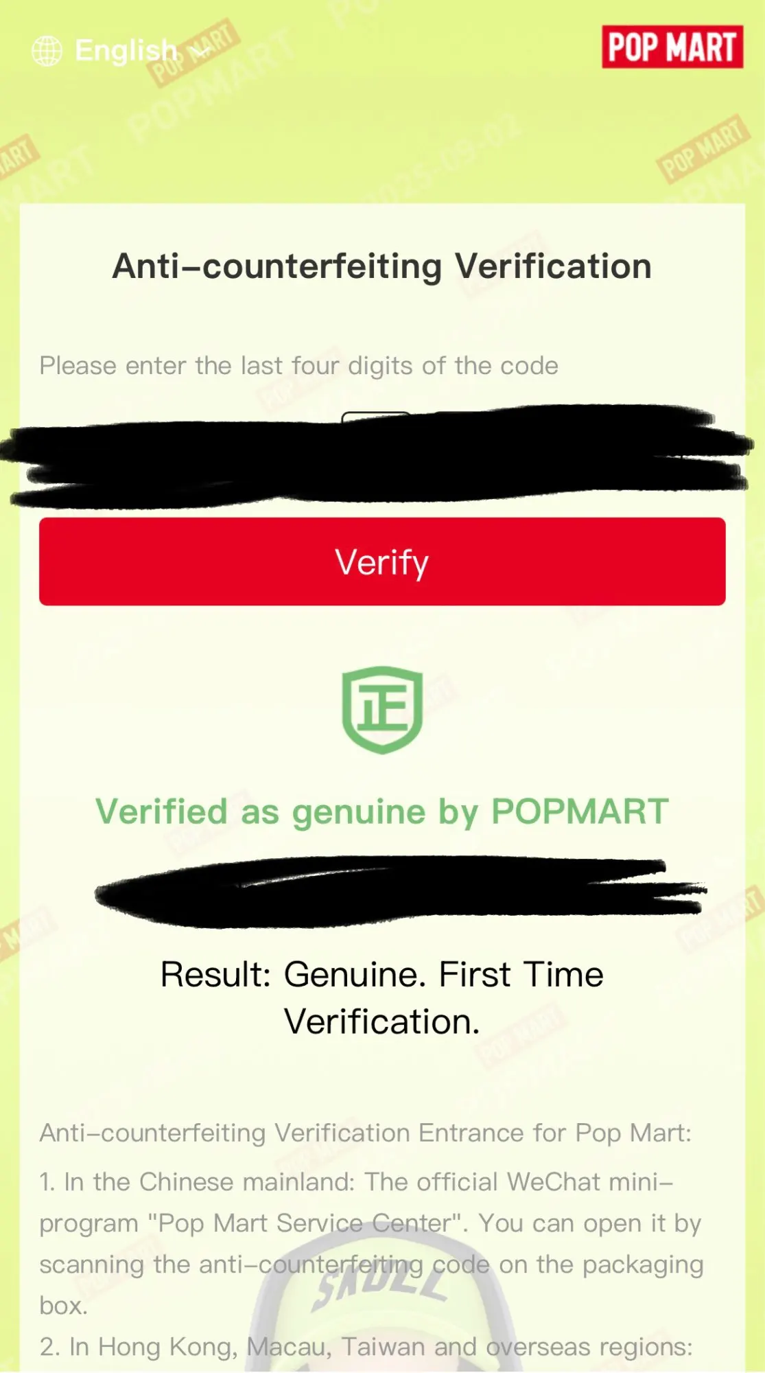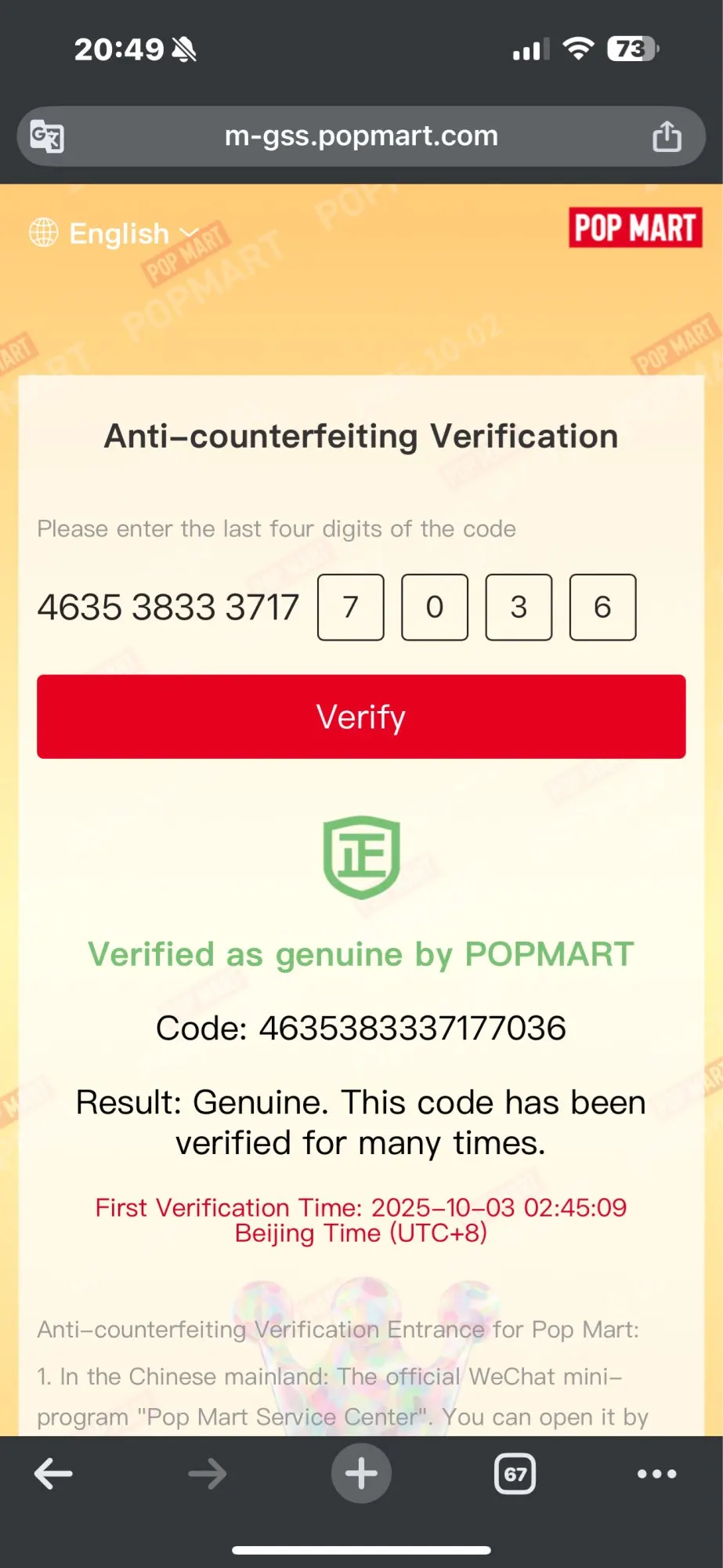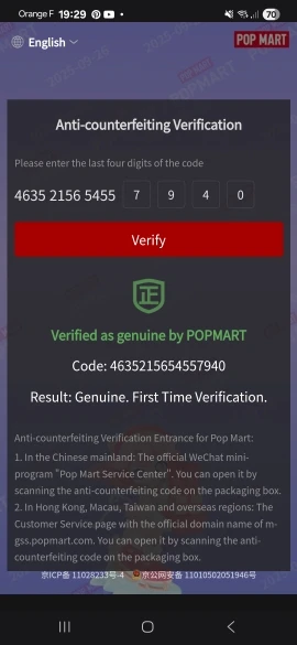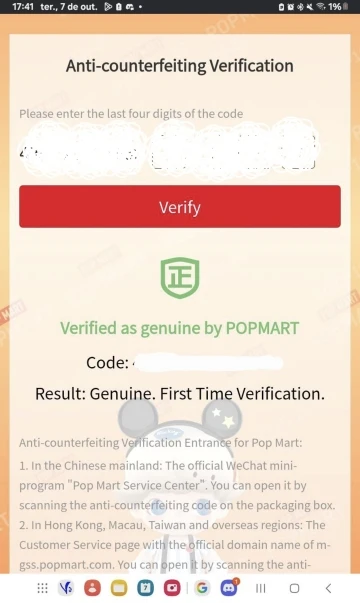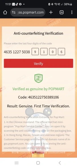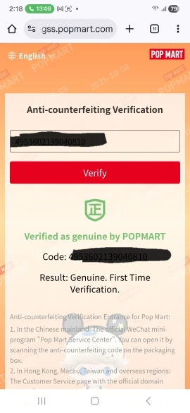 I had already purchased from this store and was satisfied, so I decided to buy the whole box and checked everything! Super authentic and with a valid code verified for the first time. Box arrived perfectly packaged with plenty of cellophane and POP MART tape. I am really super happy!!! Thank you thank you thank you!